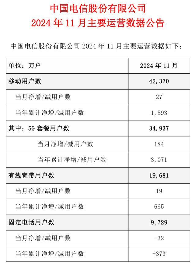 IT之家 12 月 20 日消息,中国电信今日发布公告: 2024 年 11 月移动用户数为 4.24 亿户,当月净增 27 万户,累计净增 1593 万户; 5G 套餐用户数为 3.49 亿户,当月净增 184 万户,累计净增 3071 万户; 有线宽带用户数为 1.97 亿户,当月净增 19 万户,累计净增 665 万户; 固定电话用户数为 9729 万户,当月净增-32 万户,累计净增-373 万户。 据IT之家此前报道,中国电信 2024 年第三季度营收为 1259.95 亿元,同比增...